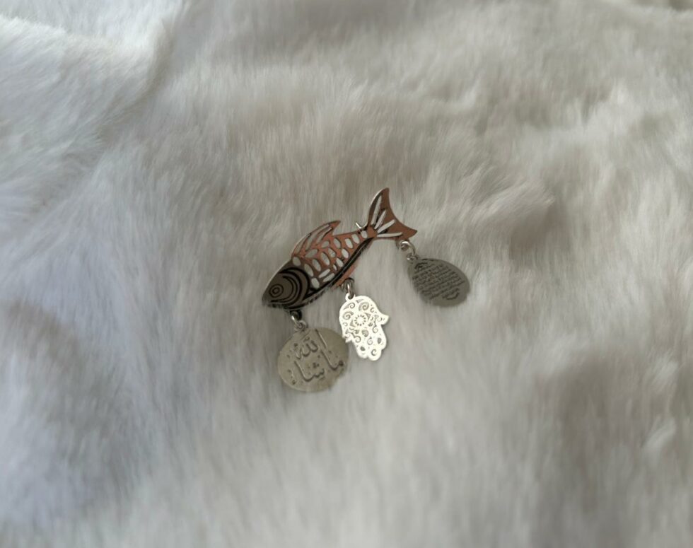 Cette broche bébé est un bijou symbolique qui combine tradition, protection et chance. Le motif central est un grand poisson, entouré de petits porte-bonheur : Khamsa, Ayat al-Kursi et un Médaillon MashaAllah (ما شاء الله). Chaque élément reflète la culture tunisienne, apportant protection et bénédiction à votre bébé au quotidien.